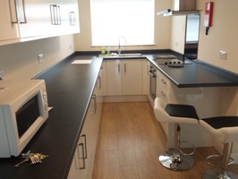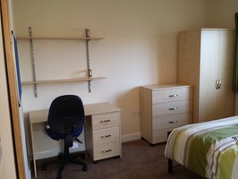 There are five bedrooms, three on the ground floor, all have a double bed, wardrobe, chest of drawers, desk, chair, shelves and a notice board. The fully fitted kitchen is complete with fridge freezer, microwave, dishwasher and electric oven and hob. There is a separate utility room with washing machine, tumble dryer and another sink.